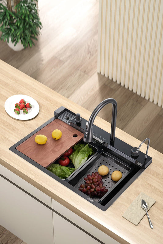 This sink, featuring a multi-functional faucet with a pull-out head offering three water modes and dual waterfall taps, is engineered for versatility.